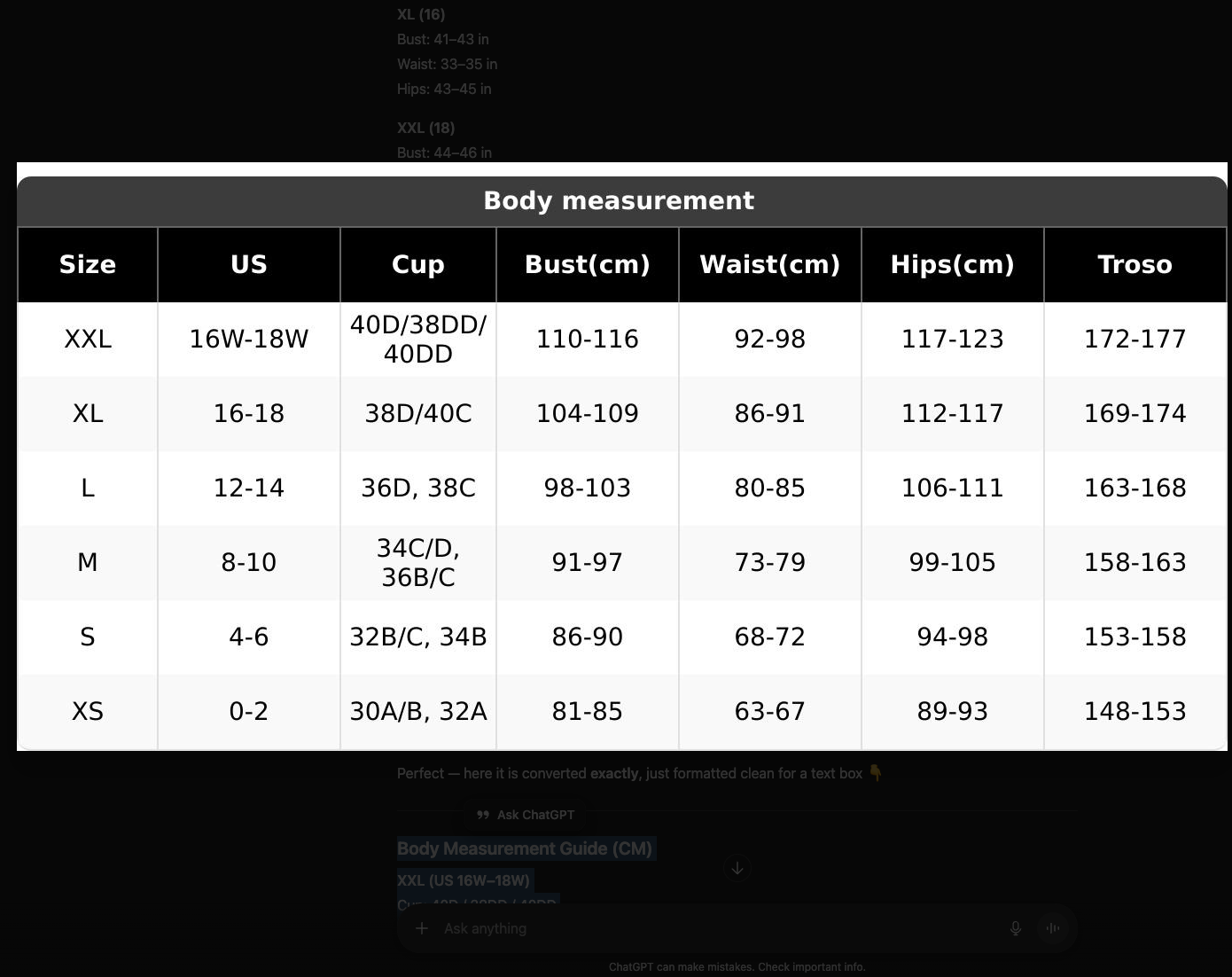 Torso: 163–168 cm